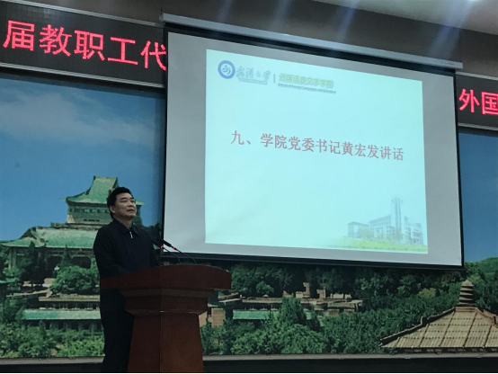 学院党委副书记、工会主席胡浩作教代会与工会工作报告,他回顾了2019-2020上半年的工作,分别从学院教代会组织建设、履职情况以及工会工作方面进行了总结。他还特别提到,在今年上半年的抗疫工作中,教代会代表和工会委员们发挥了重要作用。同时,胡浩书记对明年的教代会与工会工作进行了展望,他强调,学院将继续坚持“三级联动”、“三位一体”的工作模式,进一步加强学院教代会标准化建设,切实履行教代会职责。他还特别强调,今后外语学院教代会工作的重点在于进一步推动学院教代会代表们履职能力的提升,要强调、落实、告之代表们的知情权、参与权、表达权、监督权,使代表真正能“代表”,确保广大教职工表达正当利益和诉求的渠道畅通。