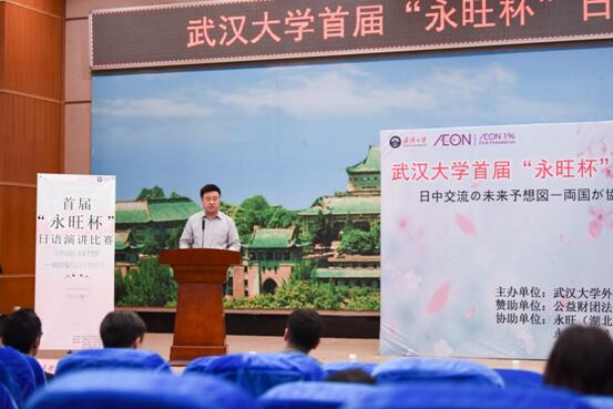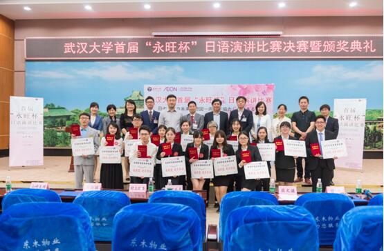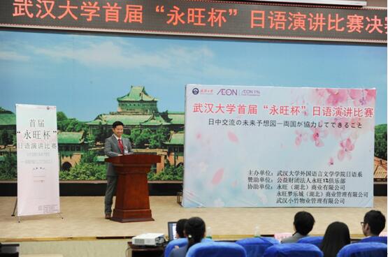 永旺(湖北)商业有限公司董事总经理杜若政彦代表永旺集团在致辞中表示,此次比赛武大学子的表现非常优秀,他感到十分欣慰,永旺1%俱乐部以及永旺集团各企业将继续资助,支持开展更多的文化交流等社会公益活动,希望青年一代早日成为中日两国友谊的使者和回报社会的主力军。