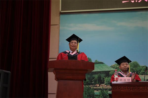 第二项,学院领导致辞,由外语学院院长马萧教授为大家带来发言。马院长首先祝贺同学们顺利毕业,在外语学院的时光值得永远纪念和珍惜。他还在讲话中回忆起校园生活中的点点滴滴,使得台下同学们笑声连连。马萧院长同时强调了同学们需要学会感恩,感恩父母、老师和身边的同学。他个人也感谢同学们孜孜不倦的求学态度,为学院增添了光芒。最后他提出了对毕业生们的三点要求:一、家国情怀是中华儿女永恒的坚守;二、梦想追求是热血青年腾飞的翅膀,青年人一定要有理想和追求;三、乐观向上是永葆青春的奥妙,知足者常乐,不要怨天尤人,以更高的标准要求自己。带着深切的不舍与喜悦,马萧院长在发言的最后深切地祝愿毕业生们前程似锦。