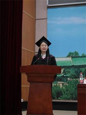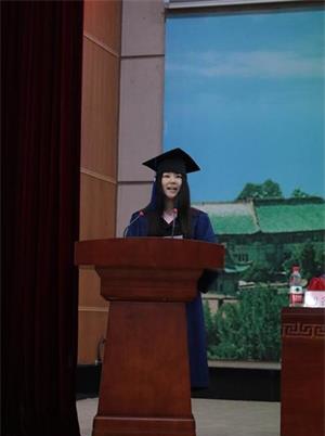 第四项,毕业研究生代表发言。研究生代表王梦恬来自2017届翻译学专业,她在发言中感恩师长的谆谆教导,在武大外院的学习生活让她更快地学会成长。在前行道路上遇到坎坷时,她提出了两个关键词——“坚持”和“初心”来面对困难。最后她代表即将离开的毕业生们为外院送上了真挚的祝福。