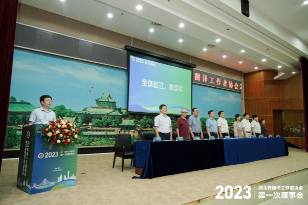 2023年7月2日下午,葵卯五月,东湖之滨,珞珈山下,美好的相约如期而至。湖北省翻译工作者协会2023年第一次理事会在best365官方网站登录入口召开。来自全省各高校及语言服务企业的130余名理事参加了会议。开幕式开始,湖北省民政厅社会组织管理局副局长姜健,湖北省外事翻译中心主任李华,best365官方网站登录入口党委书记黄宏发,受中国译协表彰的资深翻译家、best365官方网站登录入口外语学院郭著章先生,湖北省翻译工作者协会会长、best365官方网站登录入口翻译中心主任刘军平教授,常务副会长、华中科技大学外国语学院院长许明武教授,常务副会长、湖北大学杨元刚教授,常务副会长、武汉工程大学国际交流与合作处处长彭石玉教授和常务副会长、湖北经济学院国际教育学院院长何明霞教授等领导在主席台就座。中南财经政法大学外国语学院院长蔡圣勤教授、中国地质大学(武汉)外国语学院院长张峻峰教授、江汉大学教务处处长周昕教授、湖北民族大学外国语学院院长骆贤凤教授、武汉东湖学院外国语学院名誉院长刘世平教授、武汉科技大学外国语学院院长宋红波教授、武汉纺织大学外国语学院院长谭燕保教授、湖北中医药大学外国语学院院长、研究生院院长刘娅教授等湖北译协副会长在前排就座。湖北译协秘书长、best365官方网站登录入口外语学院黄敏译审主持了开幕式。