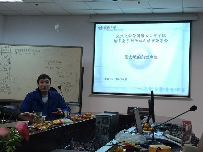 2015年3月9日晚上6:30到9:30, best365官方网站登录入口外语学院樱华读书分享会第四期在外语学院院楼3008会议室举行。这次读书会的主题为:宇宙涟漪——引力波的前世今生。主讲嘉宾有外语学院德语系主任包向飞老师,外语学院英语系主任朱宾忠老师以及外语学院党委副书记胡浩老师,吸引了来自外院、文学院等院系的近30名同学参加。