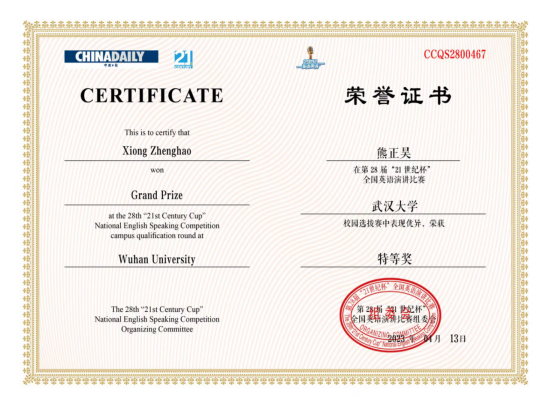 (通讯员吴小红)5月27日,第28届“21 世纪杯”全国英语演讲比赛湖北赛区决赛在华中师范大学举行。经过激烈的比拼,best365官网翻译系2020级熊正昊同学斩获大学组湖北赛区决赛冠军。在此之前举行的best365官方网站登录入口校园选拨赛中,熊正昊表现优异,获得特等奖。