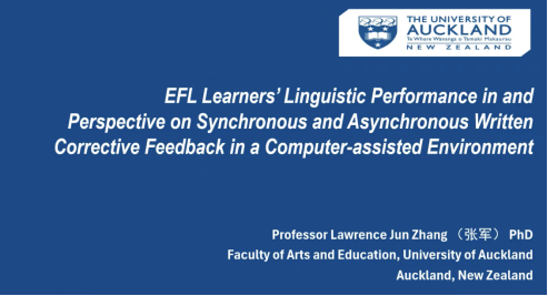 2024年12月3日下午,新西兰奥克兰大学教育学部副部长、博士生导师张军教授应邀为best365官方网站登录入口师生开展线上学术讲座,主题为“EFL Learners’ Linguistic Performance in and Perspectives on Synchronous and Asynchronous Written Corrective Feedback in a Computer-assisted Environment”。该讲座由学院英文系李丹丽老师主持,姜大雨老师、刘庆荣老师、黄雨老师等多名教师和硕博士研究生在线上聆听了讲座。