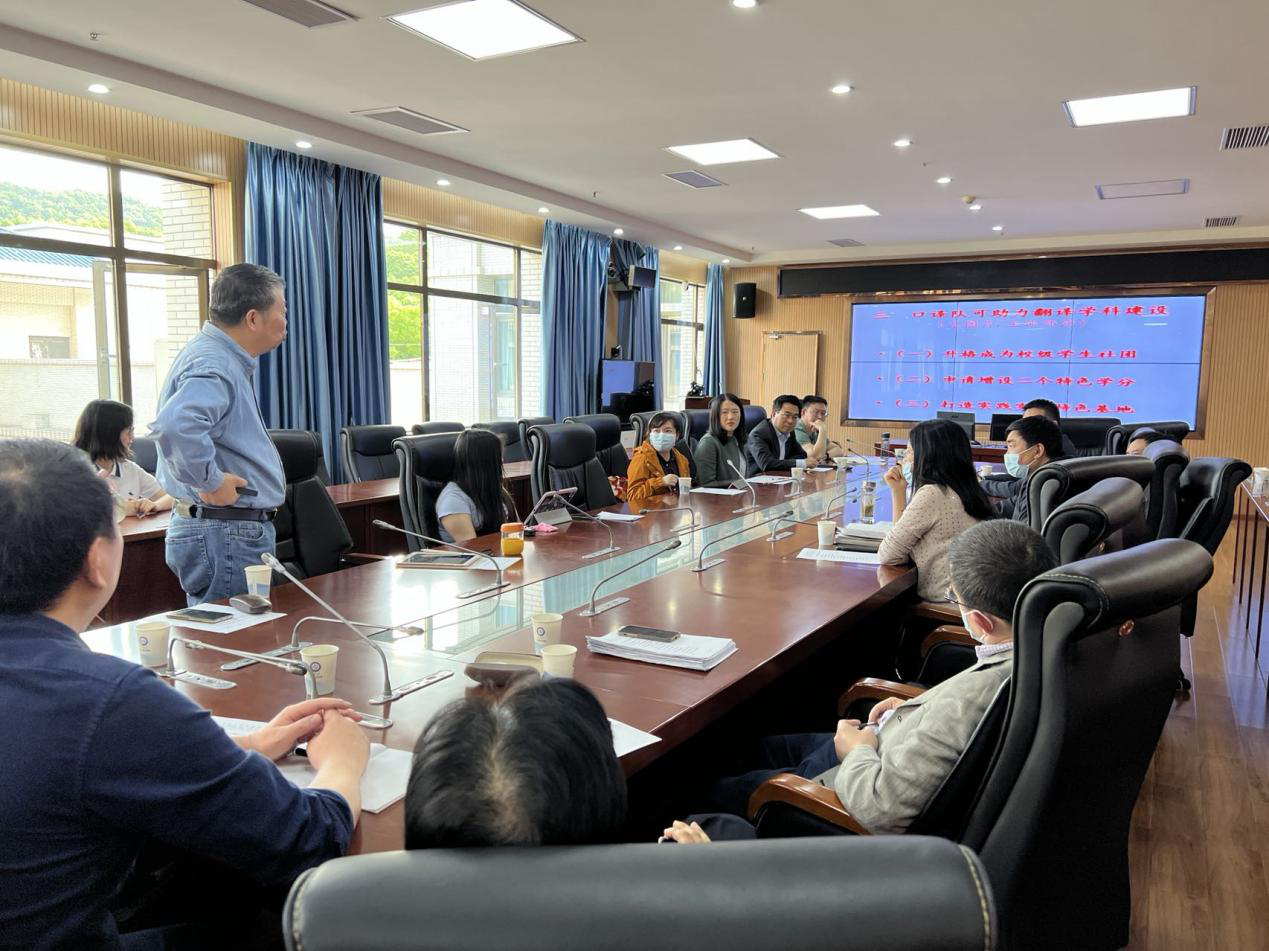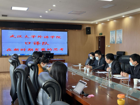 通讯员:黄雨彤 为发挥专业特色讲好中国故事、传播好中国声音,4月13日,best365官方网站登录入口口译队在外语学院4016同传室召开工作汇报座谈会,就口译队队伍建设和品牌打造等议题进行研讨。院党委书记黄宏发、院长马萧、分管研究生工作的院党委副书记周翠芳、分管本科生工作的院党委副书记刘涛、院团委书记刘迪、英文系主任张国庆、英文系副主任黄忠、大英部主任张明尧、翻译系主任熊伟、翻译系副主任江承志、口译队顾问老师吴钟明、口译队指导教师罗菁以及口译队员代表参加了此次座谈。座谈会由翻译系副主任黄敏主持。
